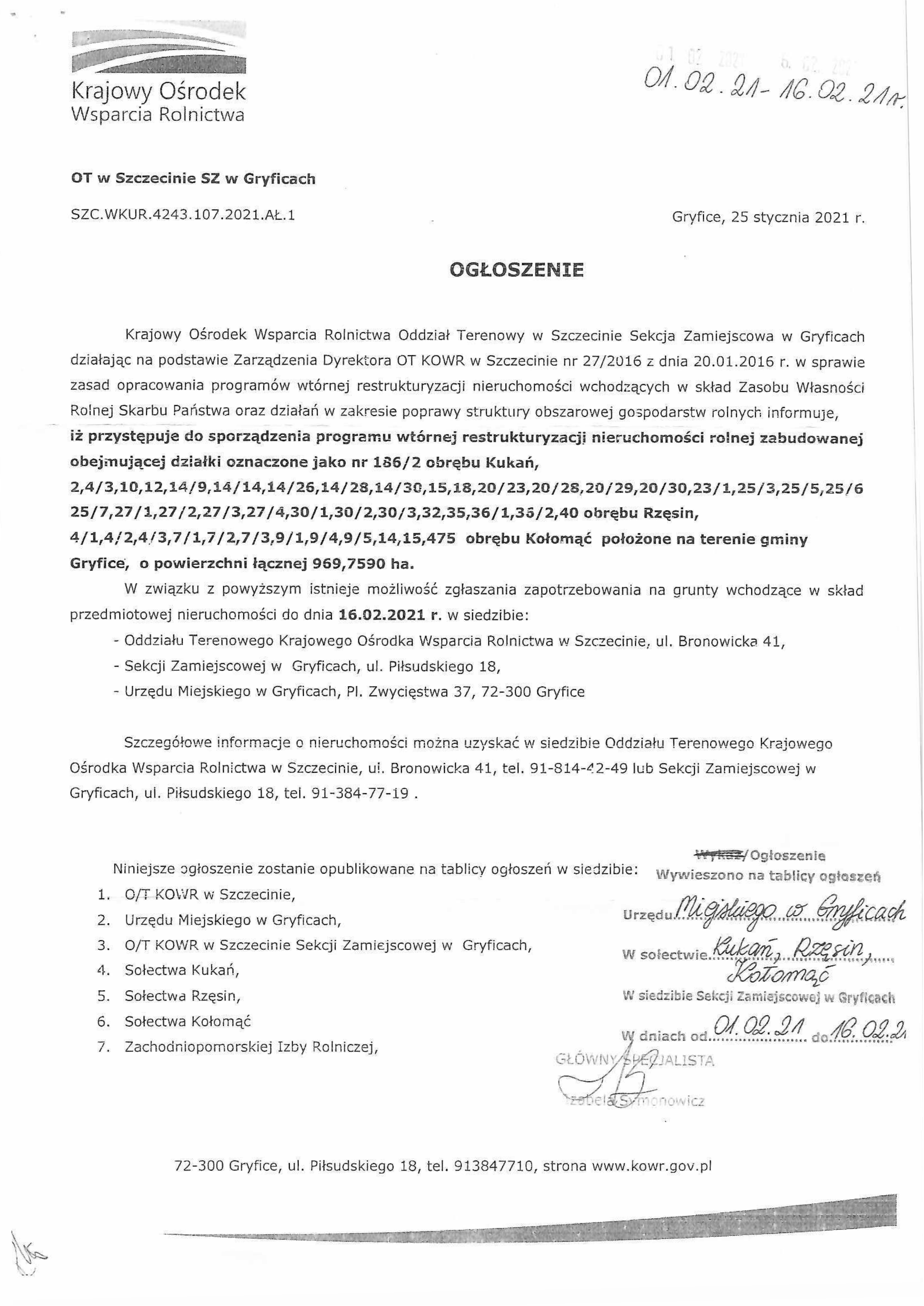 Krajowy Ośrodek Wsparcia Rolnictwa oddział Terenowy w Szczecinie Sekcja Zamiejscowa w Gryficach informuje, iż przystępuje do sporządzenia programu wtórnej restrukturyzacji nieruchomości rolnej zabudowanej obejmującej poszczególne działki w obrębie Kukania, Rzęsina oraz Kołomącia.