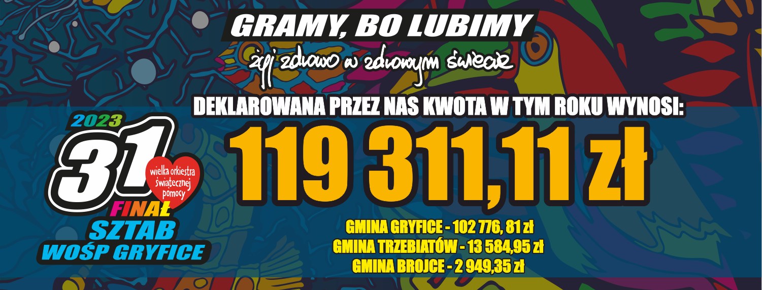 Sztab WOŚP Gryfice ogłosił pierwszą ostateczną kwotę zbiórki 31. Finału Wielkiej Orkiestry Świątecznej Pomocy w Powiecie Gryfickim, która osiągnęła historyczny wynik na kwotę 119 311,11 złotych!