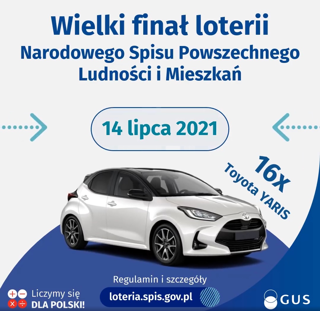 Wielki finał loterii spisowej coraz bliżej! Już 14 lipca br., o godz. 12:00, wśród wszystkich zarejestrowanych zgłoszeń rozlosujemy 16. samochodów TOYOTA Yaris! Być może to właśnie Ty staniesz się właścicielem jednego z nich!