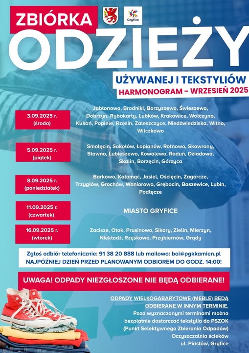 Poza wyznaczonymi terminami można bezpłatnie dostarczać tekstylia do PSZOK (Punkt Selektywnego Zbierania Odpadów) ul. Piastów, Gryfice.