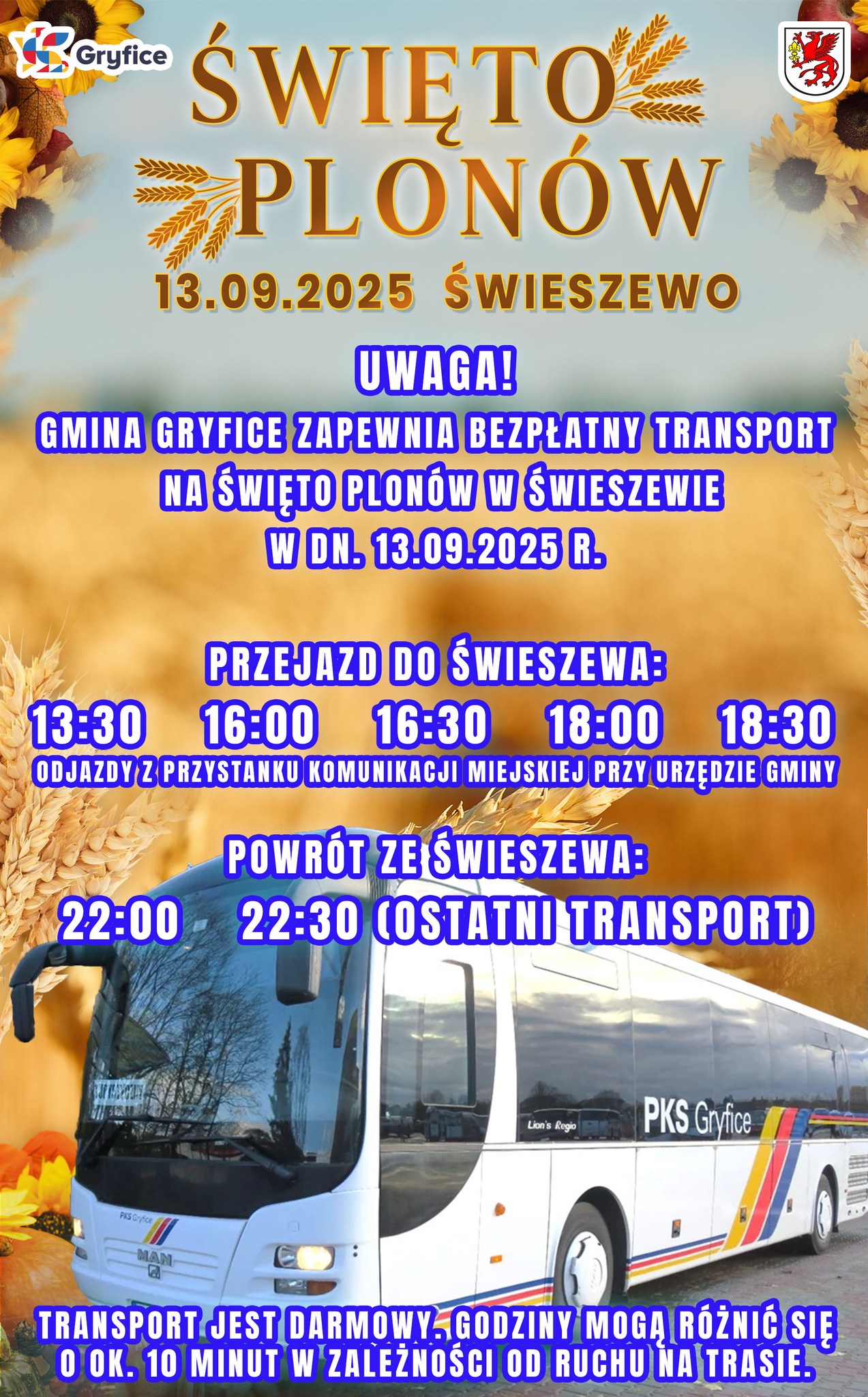 Gmina Gryfice zapewnia darmowy transport dla uczestników Święta Plonów w Świeszewie.